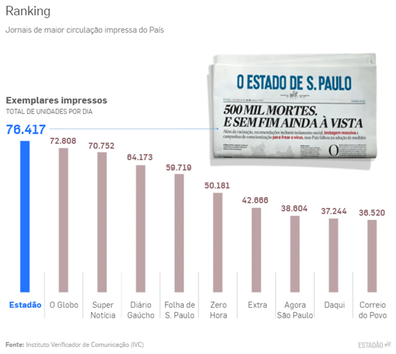 Saiu no “Estadão” (Jornal o Estado de S. Paulo) de 23 de junho de 2021 matéria comemorativa afirmado que, segundo o IVC (Instituto Verificador de Circulação), naquela data era esse diário o jornal de maior circulação brasileira. Parabéns ao jornal centenário paulista, contudo os números exibidos na própria matéria são constrangedores para ele, quanto para os outros citados.