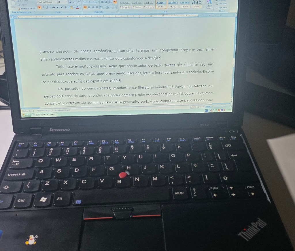 Pensando nisso, reativei um Thinkpad do começo do século para ver o que conseguia. Algo parecido com uma escrita raiz, como se fazia antigamente com as barulhentas máquinas de escrever. Eu me lembro de acompanhar, no começo dos anos 1990, a conversa de dois professores de história já com 50 +, da universidade onde trabalho, sobre as maravilhas da escrita no computador. O mais entendido, explicava ao outro que, quando se escrevia no computador, o texto ia sozinho para a outra linha, não sendo necessário o ajuste linha a linha das margens porque isso era feito automaticamente, dizia o primeiro professor, para real assombro de seu interlocutor (e riso meu). Essa característica é uma irrelevância para as novas gerações, mas eu me lembro de quantas vezes fiz alguns malabarismos para ajeitar o texto de modo a esse ficar corretamente alinhado à direita. Se o alinhamento a esquerda sempre era “grátis” nessas máquinas, o mesmo não se pode dizer do alinhamento à direita. Martírio constante dos datilógrafos. Quando você utilizava a máquina, já ia escrevendo e imprimindo ao mesmo tempo, porque, de fato, essa máquina escrevia no papel. Observe que eu acabei de usar um itálico na frase. Itálicos e quaisquer outros efeitos eram, ao menos nas máquinas básicas (grande maioria) recursos proibidos, inexistentes.