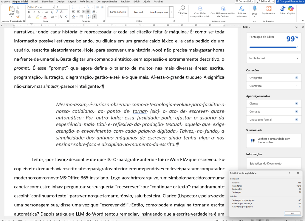 Outra função dessa nova geração de processador de textos com IA, ao menos para gente como eu, que pensa saber escrever, soa como quase ofensiva. O recurso “estruturar e refinar” permite reescrever o seu texto, de modo a torná-lo “melhor”(?). Francamente, dispenso a cortesia. Mas não para por aí. O MS Word possui ainda o recurso “Editor” que dá notas para o que você escreveu. Que maravilha! Agora posso saber se teria alguma chance na redação do ENEM, caso almejasse uma nova graduação tardia. Por falar nisso, o tal “Editor” me deu 99 pontos em 100 possíveis. Longe de ser ruim, mas fui atrás de onde estava o “1” por cento da discórdia e o erro estava justamente no infame parágrafo escrito pela IA! Deixei lá errado, o erro não foi meu. Não tenho nada com isso!